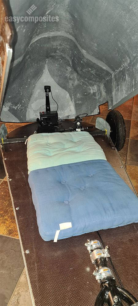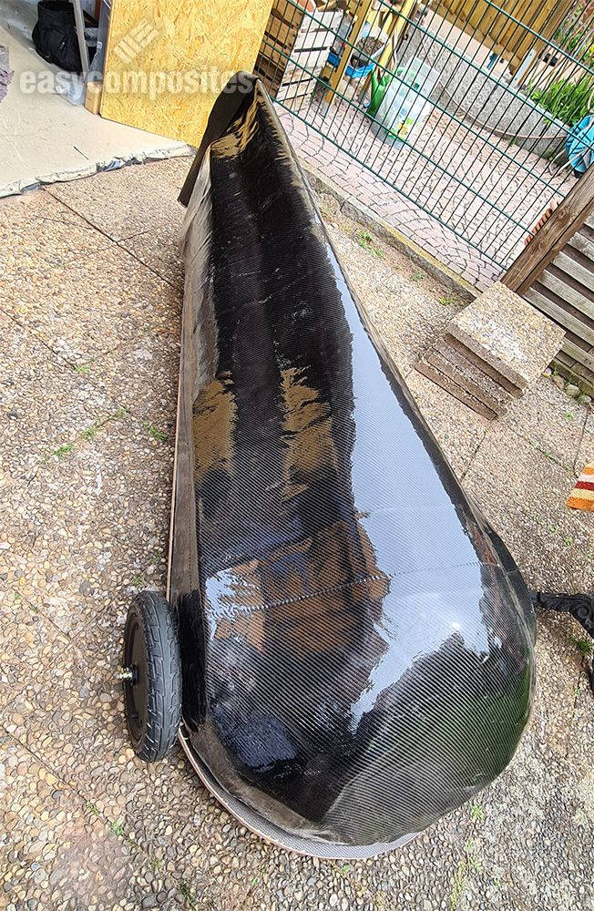 Using a mouldless construction method, similar to our UK/EU Tutorial Video or US Tutorial Video , the carbon fibre and diolen fabrics were wet laid over the foam pattern to make the body shell, then coated with XCR resin to smooth the outer finish.