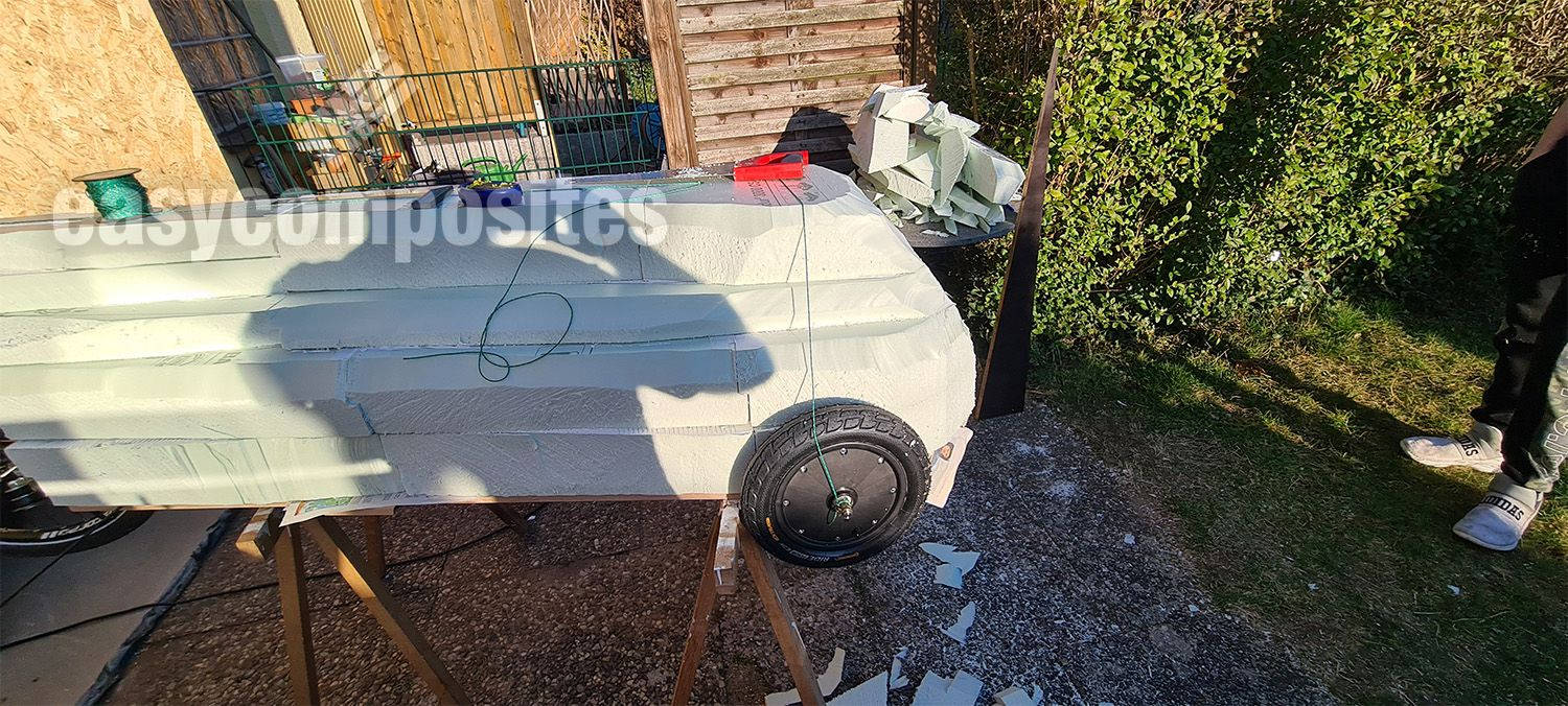 Once he had designed the basic chassis, he had to create a pattern for the body itself. This was created by carving and shaping a foam block to the desired shape. Once sanded smooth and he was happy with the shape, he could then progress to making the body itself.