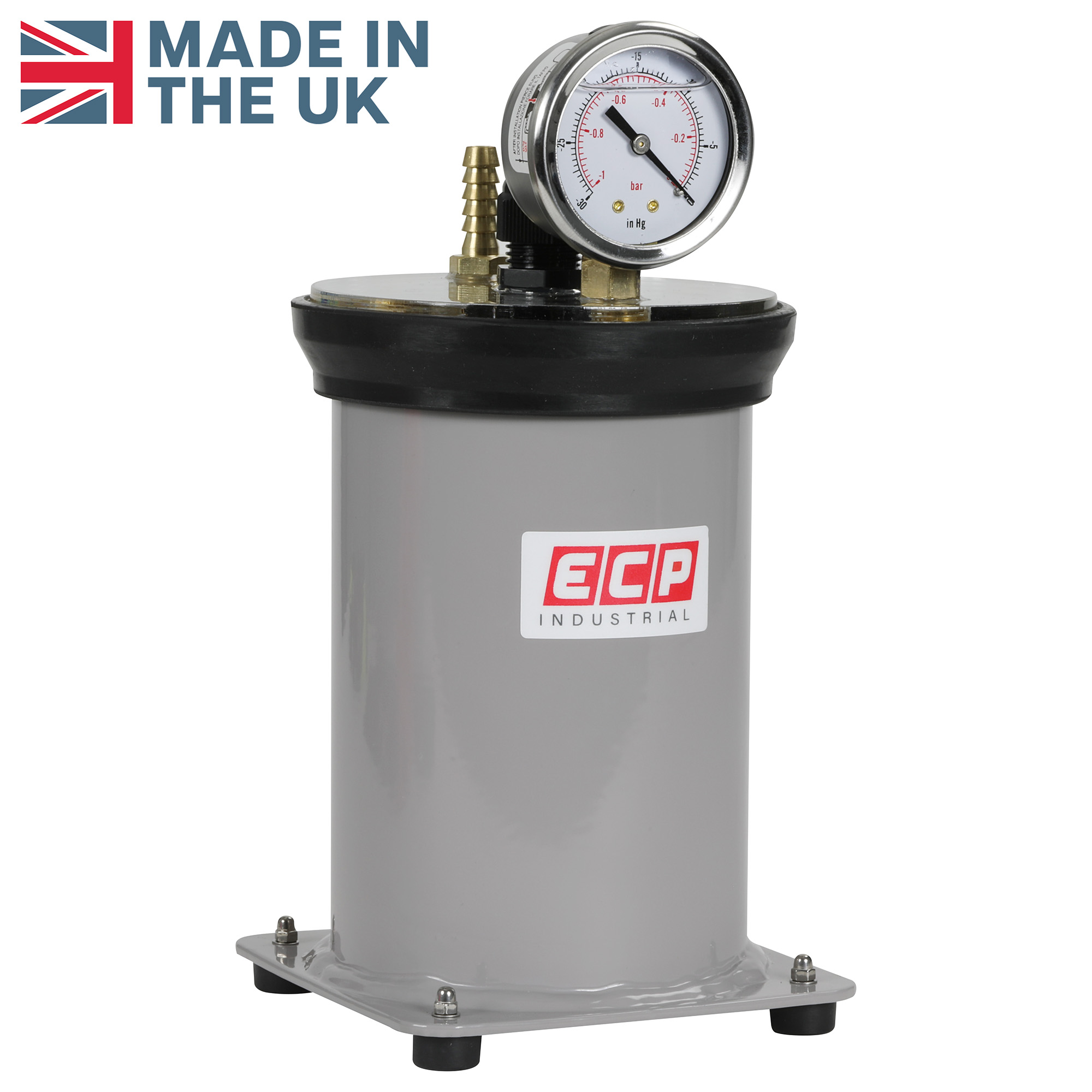 The catch-pot is manufactured from a 2mm wall steel tube and base, powder coated for a hard wearing, chemical resistant finish. The sturdy catch-pot features a laser-cut 10mm clear acrylic lid (to allow good visibility into the pot), non-slip rubber feet, a heavy duty custom-made silicone rubber positive seal, high quality glycerine-filled vacuum gauge and airtight resin line and vacuum line connections.