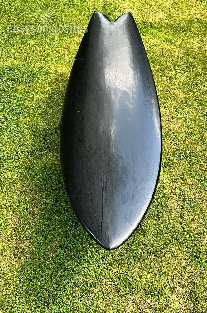 My latest project is a custom 5ft fish-style kitesurf board, fully laminated with 200g 2x2 Twill Black Diolen Cloth and epoxy resin. The board is first hand-shaped, then laminated with epoxy resin on both the bottom and top. It features one layer of S-glass fiberglass and one layer of Diolen cloth or carbon fibre. The board is then vacuum-sealed for 3 hours until the resin is fully cured.