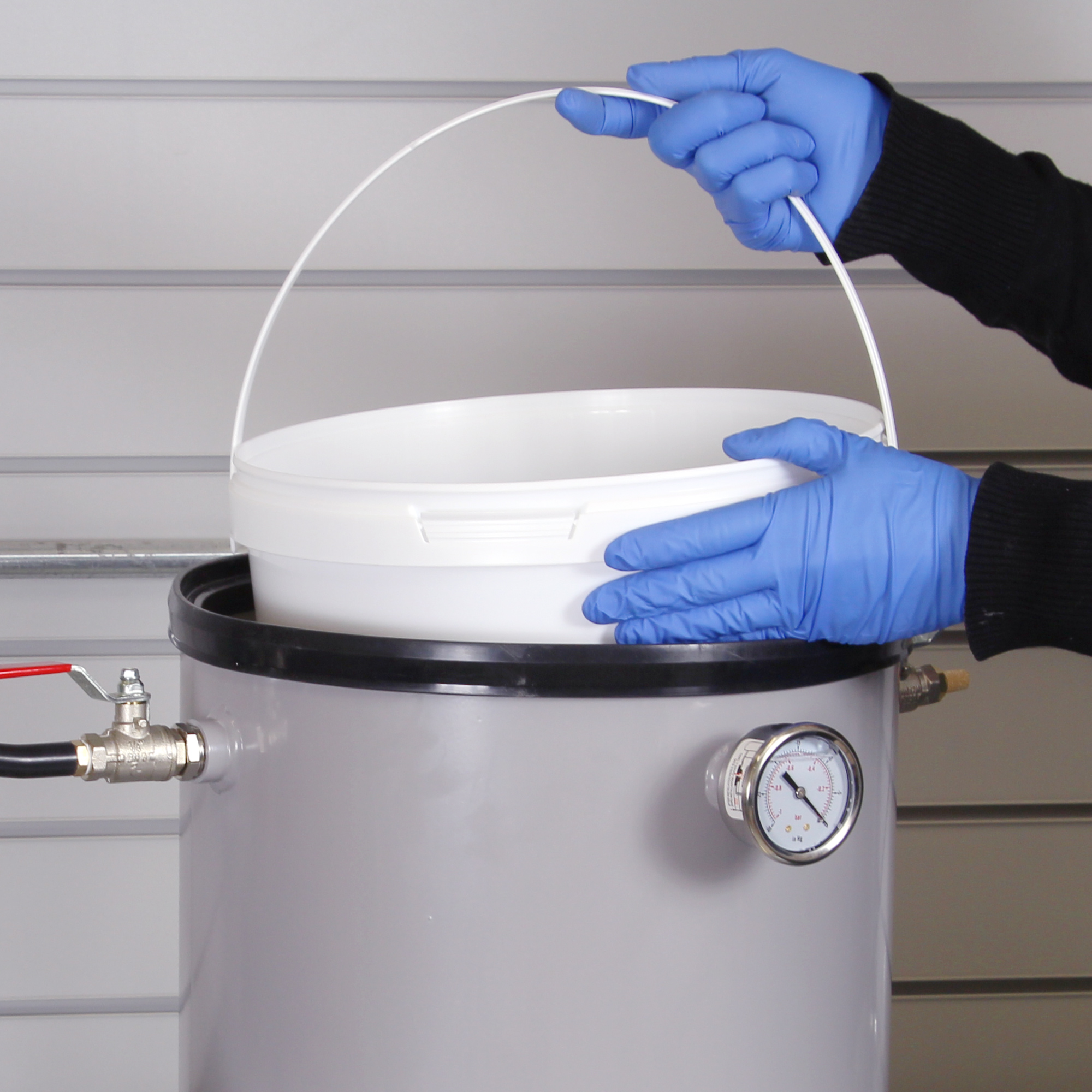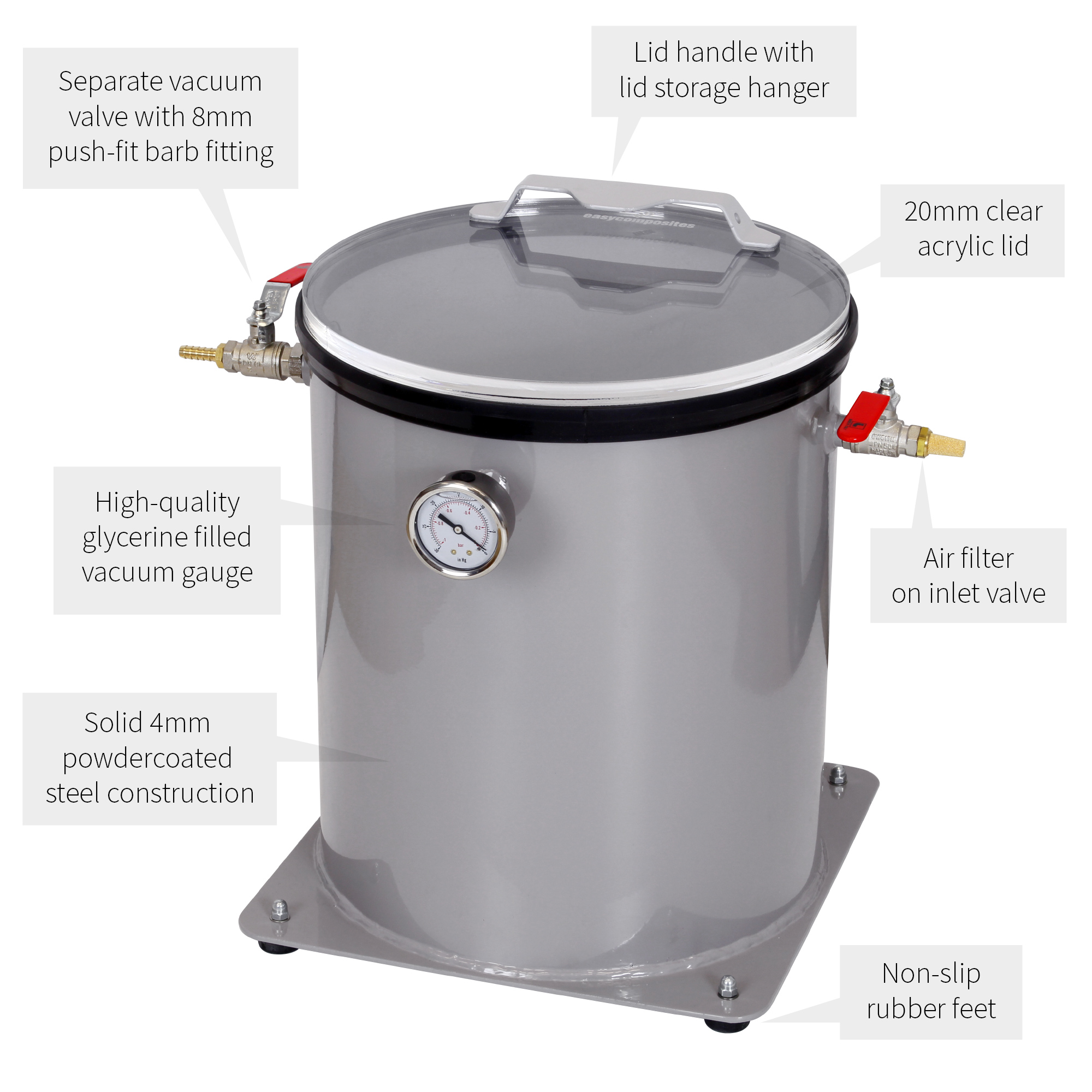 The vacuum chamber is manufactured from sturdy 4mm mild-steel and finished with a durable grey powder-coating. A clear 20mm acrylic lid provides perfect visibility into the chamber during the degassing operation whilst a custom silicone seal ensures reliable and fast sealing of the chamber.