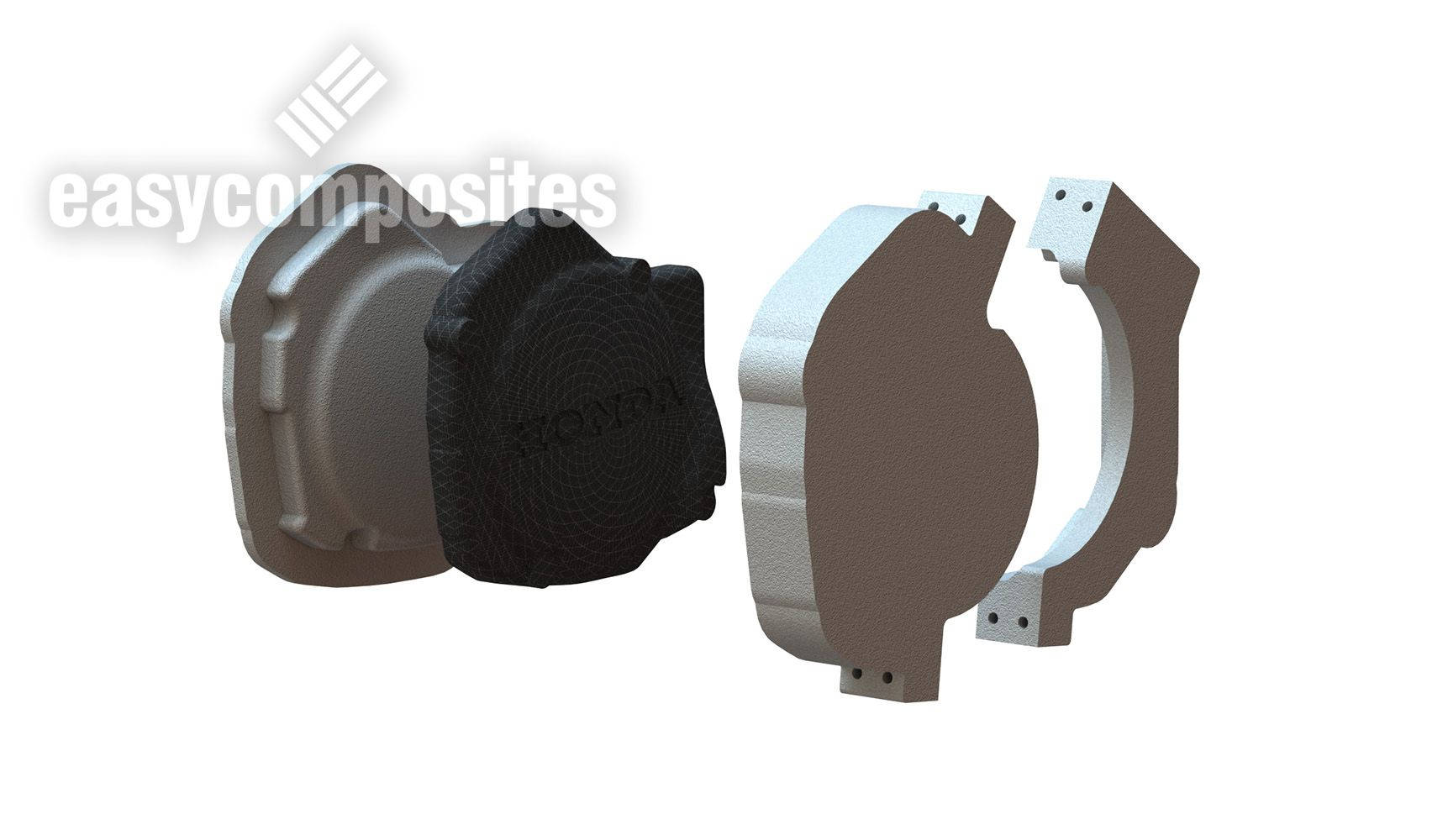 The 3D printed moulds were sanded and fettled to improve surface finish. They were then used to compression mould the actual cover using the chopped tow fibres and epoxy resin. Once cured and demoulded, the finishing process could begin.