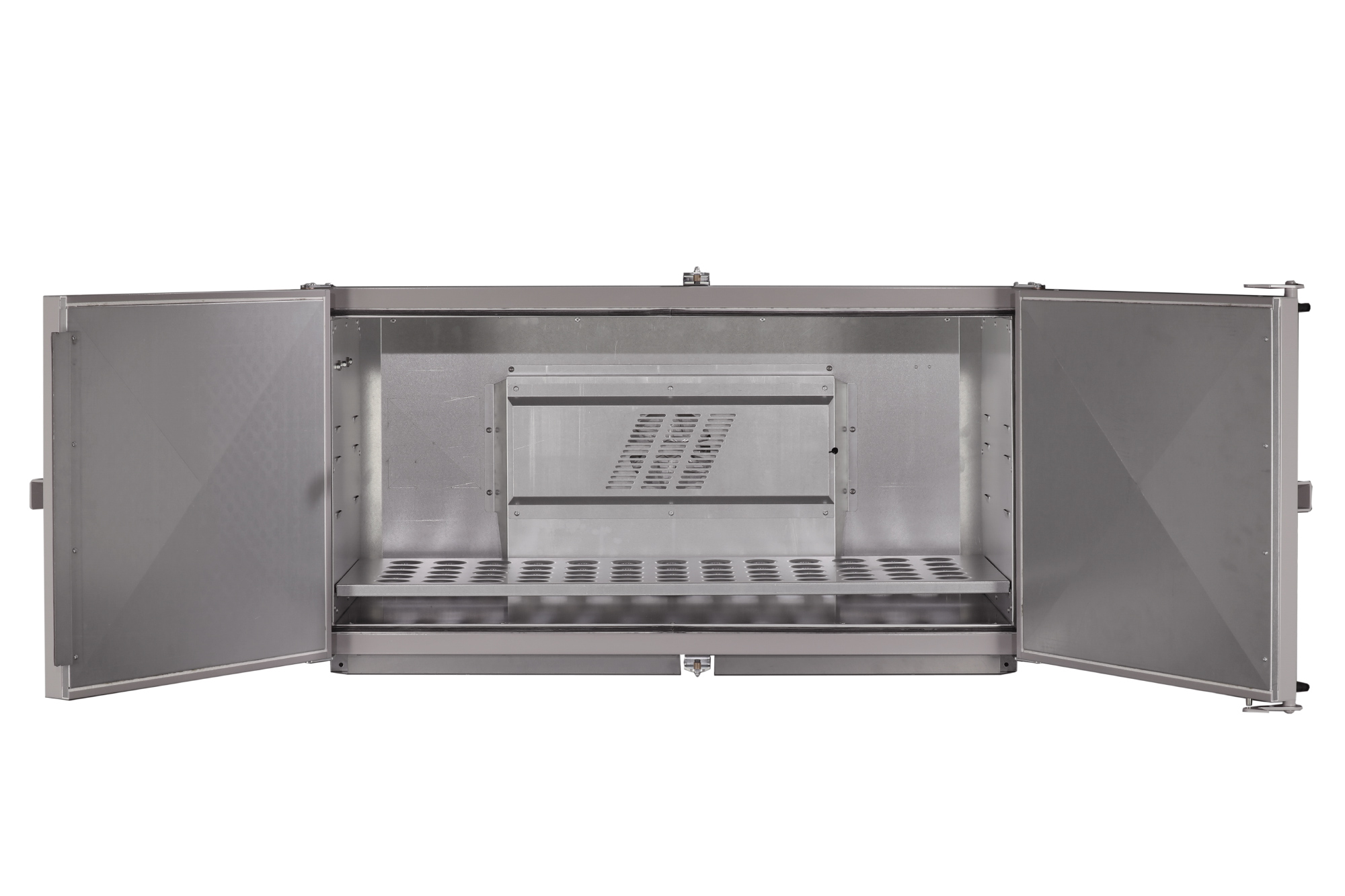 The shelf is a sheet metal construction featuring swaged ventilation holes to minimise the risk of tearing vacuum bags when loading and positioning parts, insure excellent air flow and temperature distribution, and virtually eliminate the risk of the shelves marking the part or material being processed.