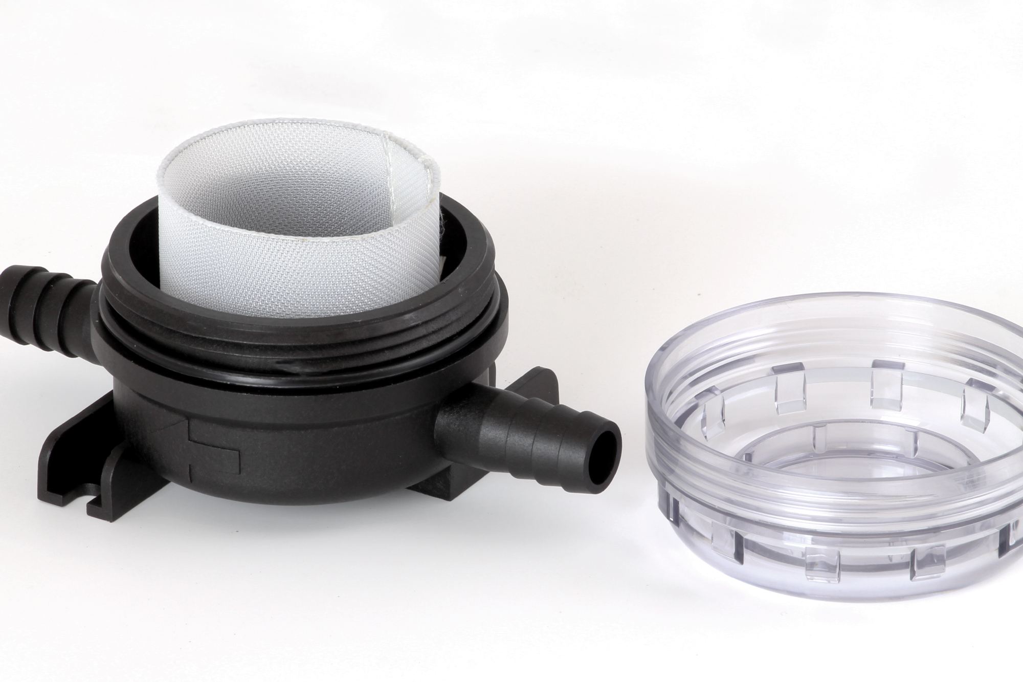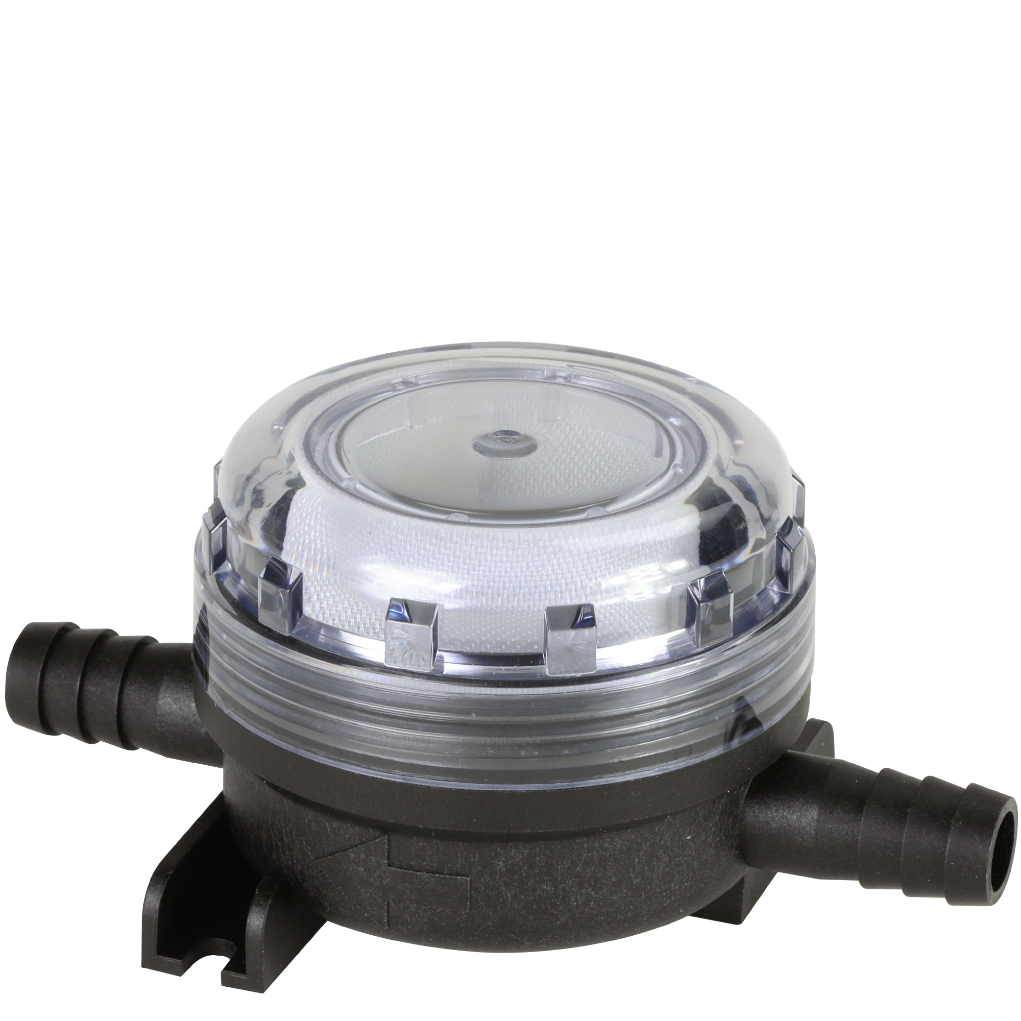 The filter sits inline and has two push-fit barbs designed for 12mm (1/2") vacuum hose.