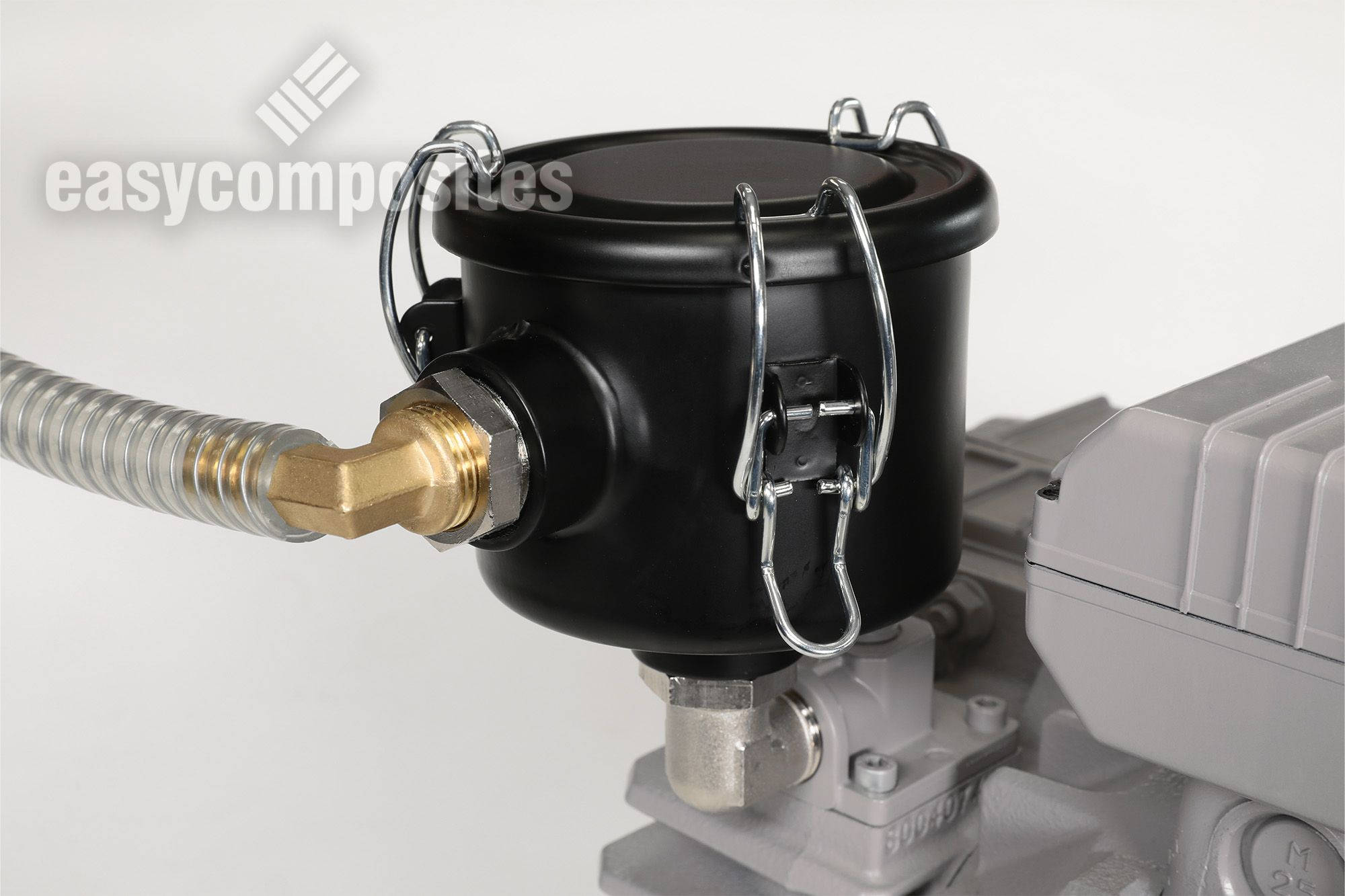 The filter should be connected to the vacuum pump via the outlet on the base of the filter. A 90° ½” male-male elbow - suitable for connection to several vacuum pumps - is included with the filter but can be substituted with any pneumatic threaded adapter (such as a male-male straight adapter), according to requirement, providing the adapter has a male ½” thread (or ¾” by removing the reducer bush).